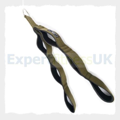 This Tricep Strap Trainer attachment for Gym Equipment Strength Work is supplied in Military Green with 3 user hand positions in a comfortable Neoprene Grip. Good sized Eyelet for Gym Grade Carabina Clips. Ideal for all Tricep Pull Down, Variable Pulley and Dual Pulley Fitness Equipment exercise